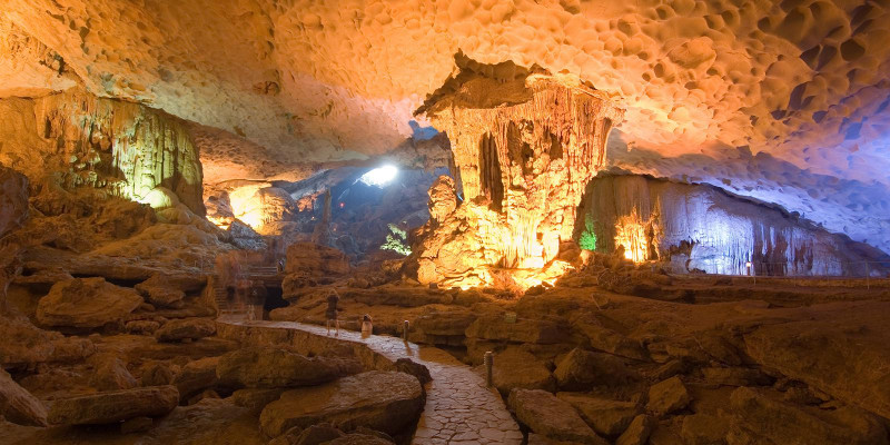 数万年かけて成長した鍾乳石が美しい、ティエンクン鍾乳洞。水面から突き出る奇岩や鍾乳石から滴る水滴、石灰岩で固められた壁面など、洞内に広がる色彩豊かなライトアップは圧巻です。