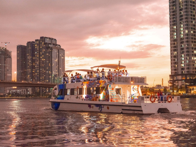 ライトアップされた街並みと夜風を感じながら、2階建て遊覧船でホーチミンの夜景を堪能。
